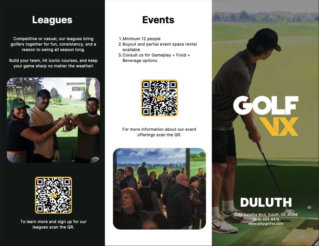 Print brochure used to promote membership sales at the Golf VX Atlanta franchise. Designed in Adobe Illustrator.